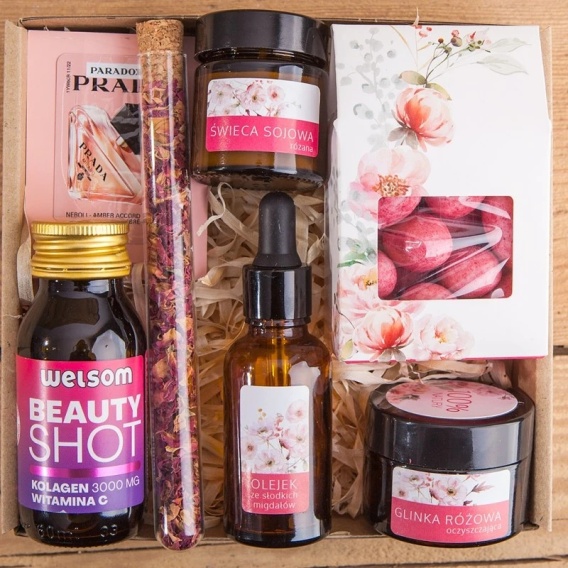 ✔ Kompozycja produktów premium – olej, glinka, świeca, przekąska i perfum