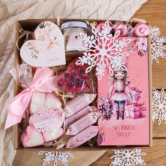 – Zestaw umieszczony jest w tekturowym pudełku z okienkiem, na naturalnej wełnie drzewnej, przewiązanym różową wstążką. Dołączony jest dwustronny bilecik z życzeniami „Wesołych Świąt” i miejscem na podpis.